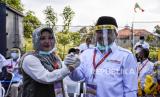 Bakal calon Bupati Bandung Nia Naser bersama bakal calon Wakil Bupati Usman Sayogi tiba untuk menyerahkan berkas pendaftaran calon Bupati dan Wakil Bupati di Kantor KPU Kabupaten Bandung, Soreang, Kabupaten Bandung, Jumat (4/9). Komisi Pemilihan Umum (KPU) Kabupaten Bandung mulai membuka pendaftaran calon Bupati dan Wakil Bupati Bandung Pilkada Serentak 2020 hingga 6 September 2020. Foto: Abdan Syakura/Republika (FOTO : ABDAN SYAKURA/REPUBLIKA)