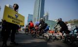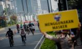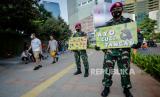REPUBLIKA.CO.ID, JAKARTA -- Prajurit TNI Korps Marinir dan Polri menggelar kampanye protokol kesehatan di kawasan Bundaran Hotel Indonesia, Jakarta, Ahad (6/9). Mereka memegang alat peraga berisi imbauan protokol kesehatan di tengah warga yang melakukan aktivitas olahraga pagi. Angka positif Covid-19 di DKI Jakarta selama sepekan terakhir mencapai 13 persen, angka tersebut melampaui ambang batas Organisasi Kesehatan Dunia (WHO) yakni dibawah 5 persen.