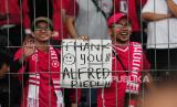 Pendukung tim nasional Indonesia mengangkat spanduk dukungan terhadap mantan pelatih timnas Indonesia Alfred Riedl usai laga leg kedua kualifikasi Piala Dunia 2014 Zona Asia antara Indonesia vs Turkmenistan di Stadion Gelora Bung Karno, Senayan, Jakarta, Kamis (28/7/2011). (FOTO : Republika/Edwin Dwi Putranto)
