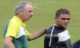 Pelatih timnas Indonesia Alfred Riedl (kiri) berbincang dengan pemain asuhannya Cristian Gonzales saat latihan jelang pertandingan babak final AFF Suzuki Cup 2010 melawan Malaysia di Lapangan Timnas Senayan, Jakarta, Senin (20/12). (FOTO : ANTARA/Andika Wahyu)