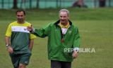 Pelatih Timnas Indonesia Alfred Riedl (kanan) dan asisten pelatih Wolfgang Pikal saat mengawasi latihan pada pelatnas Pra-Olimpiade 2012 di Lapangan PSSI, Senayan, Jakarta, Kamis (3/2/2011). (FOTO : ANTARA/Puspa Perwitasari)