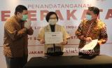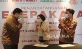 Chief Executive Officer PT Supra Boga Lestari, Meshvara Kanjaya (tengah) bersama Chief Executive Officer PT Lippo Malls Indonesia Eddy Mumin (kanan) menandatangani nota kesepakatan bersama kedua belah pihak, disaksikan oleh perwakilan Lippo Grup Henry Riady (kiri) di Jakarta, Selasa (8/9). (FOTO : Republika/Darmawan)