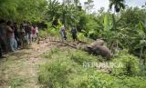 Warga mengamati bangkai Gajah sumatra (Elephas maximus sumatrensis) yang ditemukan mati di kebun milik warga di Desa Tuha Lala, Kecamatan Mila, Kabupaten Pidie, Aceh, Rabu (9/9/2020). Gajah sumatra berjenis kelamin jantan tersebut diduga mati akibat terjerat kawat listrik yang dipasang warga untuk mengusir hewan babi agar tidak merusak tanaman milik warga setempat. (FOTO : Antara/Joni Saputra)