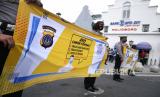 REPUBLIKA.CO.ID, YOGYAKARTA -- Polwan membawa banner saat kampanye penggunaan masker oleh Polda DIY di kawasan Malioboro Yogyakarta, Kamis (10/9). Selain kampanye penggunaan masker juga pembagian masker gratis. Hal ini salah satu upaya pengendalian Covid-19 yang akhir-akhir ini kurvanya meningkat.