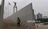 Petugas kebersihan menyiram kawasan lapangan Banteng di Jakarta, Kamis (10/9/2020). Pemprov DKI Jakarta akan kembali menutup ruang publik pada Senin (14/9/2020) untuk mencegah kerumunan saat pemberlakuan kembali PSBB total guna menekan penyebaran COVID-19.  (FOTO : ANTARA/Wahyu Putro A)