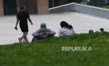 Seorang warga memainkan gawai di lapangan Banteng di Jakarta, Kamis (10/9/2020). Pemprov DKI Jakarta akan kembali menutup ruang publik pada Senin (14/9/2020) untuk mencegah kerumunan saat pemberlakuan kembali PSBB total guna menekan penyebaran COVID-19.  (FOTO : ANTARA/Wahyu Putro A)