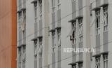 Pasien Covid-19 berada di salah satu tower di kawasan Rumah Sakit Darurat (RSD) wisma atlet, Kemayoran, Jakarta, Jumat (11/9). Rencananya tower 5 di RSD wisma atlet akan segera dibuka untuk pasien positif Covid-19 tanpa gejala untuk melakukan isolasi mandiri. Tower 5 ini berkapasitas sebanyak 886 kamar atau sekitar 1.772 tempat tidur.Prayogi/Republika. (FOTO : Prayogi/Republika)