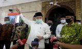 Ketua Umum Dewan Masjid Indonesia (DMI) Jusuf Kalla menjawab pertanyaan usai acara penyerahan alat semprot disinfektan mandiri di Masjid Agung Sunda Kelapa, Jakarta, Ahad (13/9). DMI bekerjasama dengan Badan Pengelola Keuangan Haji (BPKH) membagikan alat semprot disinfektan ke 3000 masjid di wilayah DKI Jakarta.Prayogi/Republika  (FOTO : Prayogi/Republika)