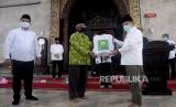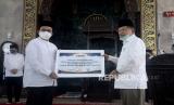Anggota Badan Pelaksana Badan Pengelola Keuangan Haji (BPKH) Rahmat Hidayat memberikan bantuan program kemaslahatan berupa alat semprot disinfektan mandiri kepada Ketua Umum Dewan Masjid Indonesia (DMI) Jusuf Kalla di Masjid Agung Sunda Kelapa, Jakarta, Ahad (13/9). DMI bekerjasama dengan Badan Pengelola Keuangan Haji (BPKH) membagikan alat semprot disinfektan ke 3000 masjid di wilayah DKI Jakarta.Prayogi/Republika      (FOTO : Prayogi/Republika)