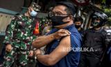 Gubernur Jawa Barat Ridwan Kamil (kiri) menunjukkan lengannya yang telah disuntikan vaksin usai menjalani uji klinis fase tiga vaksin Covid-19 di Puskesmas Garuda, Jalan Dadali, Kota Bandung, Senin (14/9). Gubernur Jawa Barat Ridwan Kamil bersama Kapolda Jabar Irjen Rudy Sufahriadi, Pangdam III/Siliwangi Mayjen TNI Nugroho Budi Wiryanto dan Kepala Kejati Jabar Ade Eddy Adhyaksa menjalani penyuntikan kedua sebagai relawan uji klinis fase tiga vaksin Covid-19. Foto: Abdan Syakura/Republika (FOTO : ABDAN SYAKURA/REPUBLIKA)