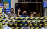 Gubernur Jawa Barat Ridwan Kamil (tengah) bersama Kapolda Jabar Irjen Rudy Sufahriadi (kiri) dan Pangdam III/Siliwangi Mayjen TNI Nugroho Budi Wiryanto (kanan) melambaikan tangan saat tiba untuk menjalani uji klinis fase tiga vaksin Covid-19 di Puskesmas Garuda, Jalan Dadali, Kota Bandung, Senin (14/9). Gubernur Jawa Barat Ridwan Kamil bersama Kapolda Jabar Irjen Rudy Sufahriadi, Pangdam III/Siliwangi Mayjen TNI Nugroho Budi Wiryanto dan Kepala Kejati Jabar Ade Eddy Adhyaksa menjalani penyuntikan kedua sebagai relawan uji klinis fase tiga vaksin Covid-19. Foto: Abdan Syakura/Republika (FOTO : ABDAN SYAKURA/REPUBLIKA)