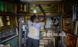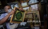 Penjual kaligrafi Roni (32) saat membersihkan kerajinan pigura dan kaligrafi di gerainya di kawasan Pasar Minggu, Jakarta, Selasa (15/9). Kaligrafi tersebut di jual dari harga Rp50.000 hingga Rp.1 juta tergantung ukuran dan tingkat kesulitannya, selama pandemi Covid-19 ia mengalami penurunan omset pendapatan mencapai 50 persen. Republika/Thoudy Badai (FOTO : Republika/Thoudy Badai)