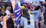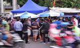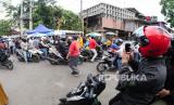 Kerumunan calon pembeli Odading Mang Oleh di Pasar Kosambi Bandung, Kamis (17/9). Antrean calon pembeli telah datang sejak pagi sebelum gerobak Mang Oleh dibuka. (FOTO : Yogi Ardhi/Republika)