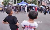 Warga menonton antrean calon pembeli Odading Mang Oleh di Bandung, Kamis (17/9). Antrean calon pembeli menjadi tontonan tersendiri bagi warga dan pedagang lain yang ada di sekitar gerobak Odading Mang Oleh (FOTO : Yogi Ardhi/Republika)