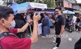 Warga merekam video antrean calon pembeli Odading Mang Oleh di Bandung, Kamis (17/9). Kemacetan akibat kerumunan calon pembeli tidak terhindarkan. (FOTO : Yogi Ardhi/Republika)