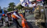 Petugas gabungan memasang pembatas jalan (water barrier) saat penutupan Jalan Asia Afrika, Kota Bandung, Jumat (18/9). Wali Kota Bandung, Oded M Danial mengatakan buka tutup jalan diberlakukan karena penyebaran covid-19 di Kota Bandung meningkat. (FOTO : ABDAN SYAKURA/REPUBLIKA)