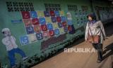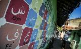 Warga melintasi mural huruf Hijaiyah yang dilukis di tembok di kawasan Cilendek, Kota Bogor, Jawa Barat, Senin (21/9). Mural yang bertuliskan kaligrafi Islam, huruf hijaiyah dan tata cara pelaksanaan wudhu dan Shalat itu untuk memberikan edukasi pendidikan Islam serta memperindah estetika kota. Republika/Putra M. Akbar (FOTO : Republika/Putra M. Akbar)