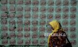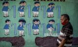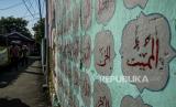 Warga melintas di dekat mural kaligrafi dan huruf Hijaiyah yang dilukis di tembok di kawasan Cilendek, Kota Bogor, Jawa Barat, Senin (21/9). Mural yang bertuliskan kaligrafi Islam, huruf hijaiyah dan tata cara pelaksanaan wudhu dan Shalat itu untuk memberikan edukasi pendidikan Islam serta memperindah estetika kota. Republika/Putra M. Akbar (FOTO : Republika/Putra M. Akbar)