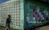 Warga melintasi mural kaligrafi yang dilukis di tembok di kawasan Cilendek, Kota Bogor, Jawa Barat, Senin (21/9). Mural yang bertuliskan kaligrafi Islam, huruf hijaiyah dan tata cara pelaksanaan wudhu dan Shalat itu untuk memberikan edukasi pendidikan Islam serta memperindah estetika kota. Republika/Putra M. Akbar (FOTO : Republika/Putra M. Akbar)