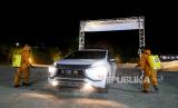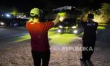 Petugas mengagus kendaraan saat menyaksikan konser dengan konsep drive-in di Sleman City Hall, Yogyakarta, Ahad (20/9) malam. Konser dengan konsep drive-in ini penonton menyaksikan musik dari dalam mobil. Mobil diatur jaraknya sedemikian rupa agar memenuhi protokol kesehatan Covid-19. Konser dengan konsep ini merupakan yang pertama di Yogyakarta sejak masa pandemi Covid-19. Grup band yang tampil pada konser ini yakni Jikustik dan Soulgroove. (FOTO : Wihdan Hidayat / Republika)