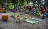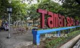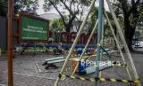 REPUBLIKA.CO.ID, BANDUNG -- Petugas merawat tanaman di area fasilitas bermain yang ditutup di Taman Superhero, Cihapit, Kota Bandung, Senin (21/9).