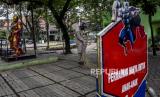 Warga beraktivitas di area fasilitas bermain yang ditutup di Taman Superhero, Cihapit, Kota Bandung, Senin (21/9). Pemerintah Kota Bandung kembali menutup sejumlah taman dan fasilitas bermain anak di Kota Bandung pada masa Adaptasi Kebiasaan Baru (AKB) yang diperketat guna meminimalisir kerumunan dalam rangka pencegahan penyebaran Covid-19. Foto: Abdan Syakura/Republika (FOTO : ABDAN SYAKURA/REPUBLIKA)