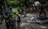 Petugas membersihkan area fasilitas bermain yang ditutup di Taman Superhero, Cihapit, Kota Bandung, Senin (21/9). Pemerintah Kota Bandung kembali menutup sejumlah taman dan fasilitas bermain anak di Kota Bandung pada masa Adaptasi Kebiasaan Baru (AKB) yang diperketat guna meminimalisir kerumunan dalam rangka pencegahan penyebaran Covid-19. Foto: Abdan Syakura/Republika (FOTO : ABDAN SYAKURA/REPUBLIKA)