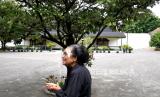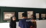 Abdi dalam menggunakan pelindung wajah saat mendampingi wisatawan di Keraton Yogyakarta, Selasa (22/9). (FOTO : Wihdan Hidayat / Republika)