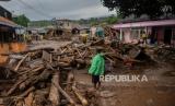 Personel kepolisian membersihkan endapan lumpur akibat terjangan banjir bandang di Kampung Cibuntu, Desa Pasawahan, Kecamatan Cicurug, Kabupaten Sukabumi, Jawa Barat, Selasa (22/9). Banjir bandang tersebut terjadi pada Senin (21/9) pukul 17.00 WIB akibat luapan sungai Citarik-Cipeuncit yang merendam tiga kecamatan yakni Cicurug, Parungkuda, Cidahu dan menyebabkan 234 rumah rusak, 210 kepala keluarga mengungsi serta tiga orang meninggal dunia. Republika/Thoudy Badai (FOTO : Republika/Thoudy Badai)