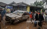 Warga mengevakuasi mobil yang terseret arus akibat banjir bandang di Kampung Cibuntu, Desa Pasawahan, Kecamatan Cicurug, Kabupaten Sukabumi, Jawa Barat, Selasa (22/9). Banjir bandang tersebut terjadi pada Senin (21/9) pukul 17.00 WIB akibat luapan sungai Citarik-Cipeuncit yang merendam tiga kecamatan yakni Cicurug, Parungkuda, Cidahu dan menyebabkan 234 rumah rusak, 210 kepala keluarga mengungsi serta tiga orang meninggal dunia. Republika/Thoudy Badai (FOTO : Republika/Thoudy Badai)