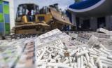 Petugas mengoperasikan alat berat untuk memusnakan barang yang menjadi milik negara di Palembang, Sumatera Selatan, Rabu (23/9/2020). Kantor Wilayah Bea dan Cukai Sumatera bagian timur bersama Kantor Pengawasan dan Pelayanan Bea dan Cukai Type Madia Pabean B Palembang memusnahan 5.714.869 batang rokok ilegal, 330 botol minuman keras impor ilegal, 200.800gram tembakau iris, delapan buah airsoft gun, 125 buah sex toys, 10 buah dental equipment, 186 buah busur panah dan 432 buah karpet dengan total nilai sebesar Rp2,8 miliar dengan potensi kerugian negara yang ditimbulkan sebesar Rp2,7 miliar. (FOTO : ANTARA/Nova Wahyudi)