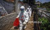 Petugas Dinas Kesehatan Kabupaten Bogor berjalan menuju rumah warga saat akan melakukan test swab di Bojong Gede, Kabupaten Bogor, Jawa Barat, Rabu (23/9/2020). Dinkes Kabupaten Bogor melakukan sistem jemput bola untuk melakukan swab test ke rumah-rumah warga yang tidak mau datang ke puskesmas untuk mengikuti swab test, guna memutus mata rantai penyebaran COVID-19. ANTARA FOTO/Yulius Satria Wijaya/aww. (FOTO : ANTARA FOTO/Yulius Satria Wijaya)