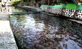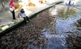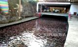 Saluran sungai dipenuhi ikan nila di Wisata Air Watergong, Klaten, Jawa Tengah, Kamis (24/9). Sejak dua tahun terakhir ini kawasan Watergong berubah konsep dari Waterboom menjadi wisata alam budidaya ikan. Panjang sungai 100 meter dengan lebar lima meter dibagi menjadi tiga petak budidaya ikan. Untuk satu petak saat bisa menghasilkan 20 ton ikan nila saat panen. Pengunjung bisa menikmati sungai jernih dengan penuh ikan secara gratis. Dan bisa menikmati makanan dengan menu ikan di restoran Watergong. (FOTO : Wihdan Hidayat / Republika)