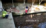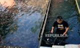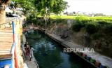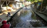 Pekerja membersihkan saluran sungai di Wisata Air Watergong, Klaten, Jawa Tengah, Kamis (24/9). Sejak dua tahun terakhir ini kawasan Watergong berubah konsep dari Waterboom menjadi wisata alam budidaya ikan. Panjang sungai 100 meter dengan lebar lima meter dibagi menjadi tiga petak budidaya ikan. Untuk satu petak saat bisa menghasilkan 20 ton ikan nila saat panen. Pengunjung bisa menikmati sungai jernih dengan penuh ikan secara gratis. Dan bisa menikmati makanan dengan menu ikan di restoran Watergong. (FOTO : Wihdan Hidayat / Republika)