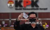 Kepala Biro Hubungan Masyarakat Febri Diansyah mengangkat kartu identitas pegawai Komisi Pemberantasan Korupsi (KPK) usai menyampaikan pengunduran dirinya sebagai pegawai dari lembaga anti korupsi tersebut di gedung KPK, Kamis (24/9/2020). Mantan Juru Bicara KPK tersebut mengundurkan diri sebagai Kepala Biro Humas sekaligus Pegawai KPK karena merasa kondisi politik dan hukum telah berubah tidak sesuai dengan semangat independensi sebagai lembaga pemberantas korupsi seperti awal dirinya menjadi bagian KPK. (FOTO : Antara/Muhammad Adimaja)