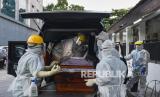 Sejumlah tenaga kesehatan memasukkan peti berisi jenazah almarhum dokter Jhon Andi Zainal yang meninggal akibat COVID-19, di halaman RSUD Arifin Achmad, Kota Pekanbaru, Riau, Kamis (24/9/2020). Sudah tiga tenaga kesehatan di Riau yang terdiri dari dua dokter dan seorang perawat, wafat karena terpapar COVID-19 saat menjalankan tugas. (FOTO : Antara/FB Anggoro)