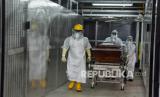Sejumlah tenaga kesehatan membawa peti berisi jenazah almarhum dokter Jhon Andi Zainal yang meninggal akibat COVID-19, di halaman RSUD Arifin Achmad, Kota Pekanbaru, Riau, Kamis (24/9/2020). Sudah tiga tenaga kesehatan di Riau yang terdiri dari dua dokter dan seorang perawat, wafat karena terpapar COVID-19 saat menjalankan tugas. (FOTO : Antara/FB Anggoro)