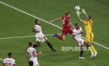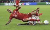 Youssef En-Nesyri (kiri) tampak kecewa saat gagal memanfaakan kesempatan pada laga UEFA Super Cup di Puskas Arena, Budapest, Hongaria, Jumat (25/9) dini hari. (FOTO : Bernadett Szabo/AP Pool)