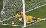 Kiper Sevila, Bono gagak menahan bola yang lesakkan Javi Martinez pada laga UEFA Super Cup di Puskas Arena, Budapest, Hongaria, Jumat (25/9) dini hari. (FOTO : Laszlo Szirtesi/Pool Getty)