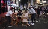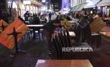 Pekerja merapikan bangku untuk menutup restorannya sebelum pukul 10 malam ketika masih ada pelanggan di Soho, London, Inggris, Kamis (24/9). Pemerintah Inggris telah mengumumkan bahwa pub, bar, dan restoran harus tutup pukul 10 malam mulai Kamis (24/9). Pembatasan jam operasional itu diberlakukan untuk membantu mengurangi lonjakan kasus virus Corona di Inggris. EPA-EFE / ANDY RAINGaleri Foto (FOTO : EPA-EFE/ANDRE PAIN )