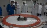 Pengunjung dan pekerja berbincang sambil melihat botol Vaksin untuk COVID-19 yang diproduksi di pabrik vaksin SinoVac di Beijing, Kamis (24/9). SinoVac, salah satu perusahaan farmasi China yang memproduksi kandidat vaksin COVID-19. Perusahaan farmasi terkemuka tersebut mengatakan vaksinnya akan siap pada awal 2021 untuk distribusi di seluruh dunia termasuk AS AP Photo / Ng Han GuanGaleri Foto (FOTO : AP Photo / Ng Han Guan)