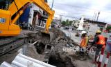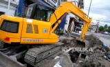 Alat berat digunakan saat proyek penataan kawasan Tugu Pal Putih, Yogyakarta, Jumat (25/9). Pemerintah Kota Yogyakarta melanjutkan penataan kawasan jalur pedestrian Jalan Sudirman dan Tugu Pal Putih. Untuk jalur pedestrian yakni di Jalan Sudirman melanjutkan jalur pedestrian tahap pertama. Sedangkan untuk kawasan Tugu salah satunya akan memindahkan kabel-kabel ke dalam tanah. Revitalisasi ini akan memadukan konsep cagar budaya dengan sumbu filosofis. (FOTO : Wihdan Hidayat / Republika)