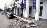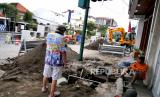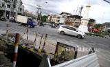 Proyek penataan kawasan Tugu Pal Putih, Yogyakarta, Jumat (25/9). Pemerintah Kota Yogyakarta melanjutkan penataan kawasan jalur pedestrian Jalan Sudirman dan Tugu Pal Putih. Untuk jalur pedestrian yakni di Jalan Sudirman melanjutkan jalur pedestrian tahap pertama. Sedangkan untuk kawasan Tugu salah satunya akan memindahkan kabel-kabel ke dalam tanah. Revitalisasi ini akan memadukan konsep cagar budaya dengan sumbu filosofis. (FOTO : Wihdan Hidayat / Republika)