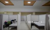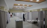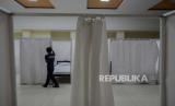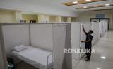 Petugas merapikan ruangan isolasi mandiri pasien Covid-19 di Gelanggang Remaja Kecamatan Pademangan, Jakarta Utara, Sabtu (26/9). Sebanyak 30 bilik isolasi pasien Covid-19 disediakan di Gelanggang Remaja Kecamatan Pademangan yang dilengkapi fasilitas tempat tidur, lemari, dan perlatan mandi. Selain itu tempat tersebut menjadi percontohan graha sehat mandiri pasien Covid-19 di DKI Jakarta berdasarkan kajian dari Dewan Riset DKI Jakarta. (FOTO : Republika/Thoudy Badai)