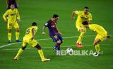 Lionel Messi beraksi pada pertandingan sepak bola La Liga Spanyol antara FC Barcelona dan Villarreal CF yang diadakan di Camp nou Stadium, di Barcelona, Spanyol, Senin (28/9) dini hari WIB. (FOTO : EPA-EFE / ENRIC FONTCUBERTA)