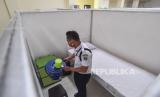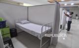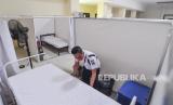 Petugas merapikan ruang isolasi mandiri pasien COVID-19 di Gelanggang Remaja Kecamatan Pademangan, Jakarta, Ahad (27/9/2020). GOR Kecamatan Pademangan yang merupakan percontohan graha sehat mandiri pasien COVID-19 tersebut telah menyiapkan 30 bilik isolasi pasien COVID-19 dengan fasilitas tempat tidur, lemari, dan peralatan mandi. (FOTO : ANTARA/Muhammad Adimaja)