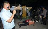 Petugas kepolisian memberikan hukuman fisik kepada warga yang tidak menggunakan masker, di Kabupaten Gowa, Sulawesi Selatan, Selasa (29/9/2020) malam. Patroli kepatuhan memakai masker tersebut sebagai sosialisasi dalam menerapkan protokol kesehatan guna menekan penyebaran COVID-19 di Kabupaten Gowa. (FOTO : ABRIAWAN ABHE/ANTARA )