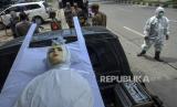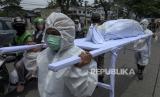 Petugas gabungan memanggul keranda berisi boneka pocong saat melaksanakan razia masker di Medan, Sumatera Utara, Selasa (29/9/2020). Razia masker dengan membawa boneka pocong tersebut untuk mengingatkan masyarakat agar tetap menerapkan protokol kesehatan guna mencegah penyebaran COVID-19. (FOTO : Antara/Irsan Mulyadi)