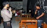 Petugas kepolisian melakukan sosialisasi kepatuhan menggunakan masker kepada warga yang berkumpul di salah satu cafe, di Kabupaten Gowa, Sulawesi Selatan, Selasa (29/9/2020) malam. Patroli kepatuhan memakai masker tersebut sebagai sosialisasi dalam menerapkan protokol kesehatan guna menekan penyebaran COVID-19 di Kabupaten Gowa. (FOTO : ABRIAWAN ABHE/ANTARA)
