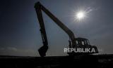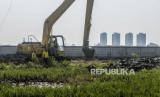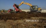 Petugas menggunakan alat berat saat menggarap lahan yang akan dijadikan lokasi pemakaman khusus Covid-19 di Rorotan, Jakarta, Rabu (30/9). Lokasi yang dulunya merupakan lahan pertanian itu akan dijadikan tempat pemakaman khusus Covid-19 dengan luas sebesar dua hektare dan diperkirakan dapat menampung sekitar 5.000 petak makam. Republika/Putra M. Akbar (FOTO : Republika/Putra M. Akbar)